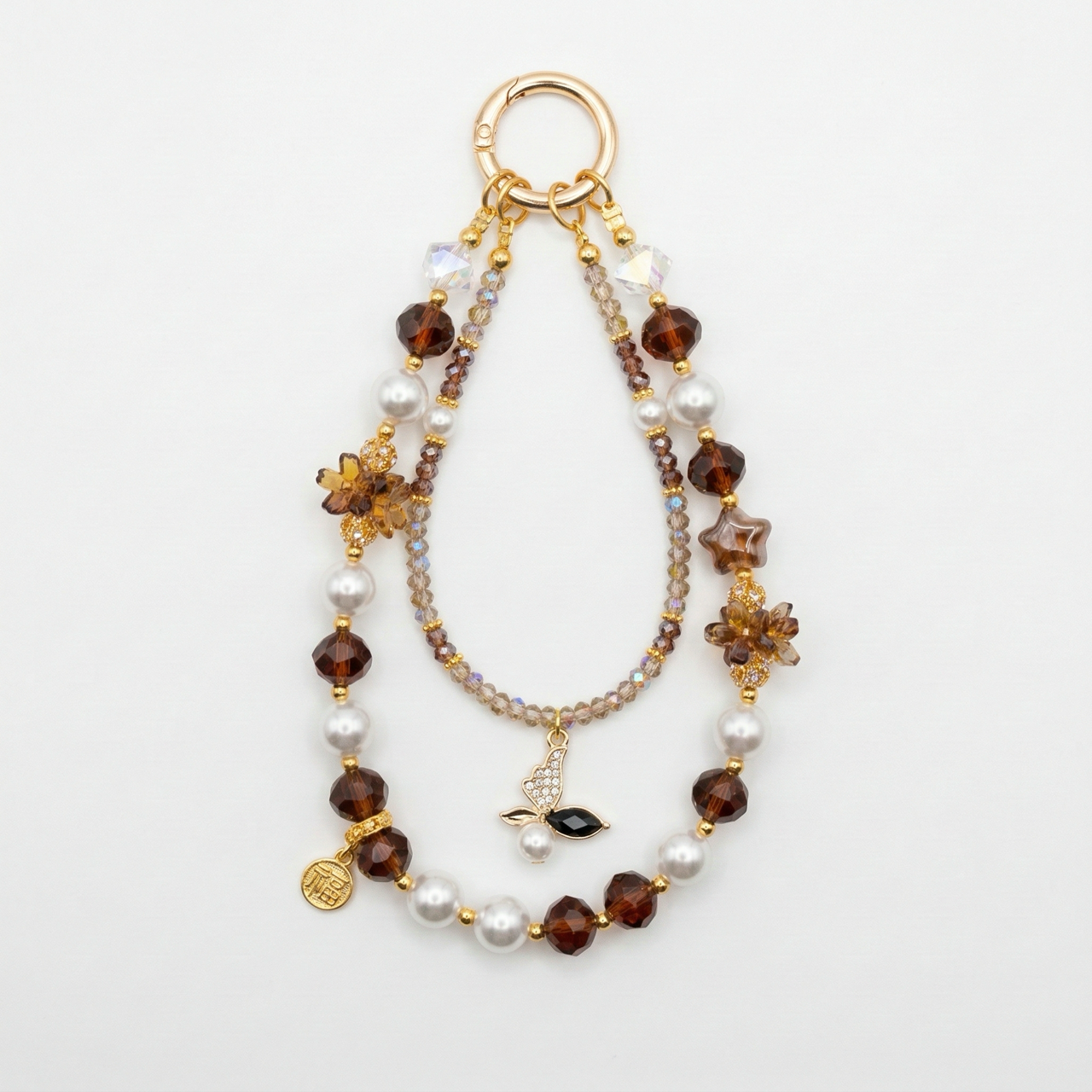This elegant beaded phone charm features a warm and sophisticated design created with brown crystal beads, pearl accents, and gold-tone hardware. The highlight of the piece is the delicate butterfly pendant with rhinestone detailing and a pearl drop, adding a refined and graceful touch.
