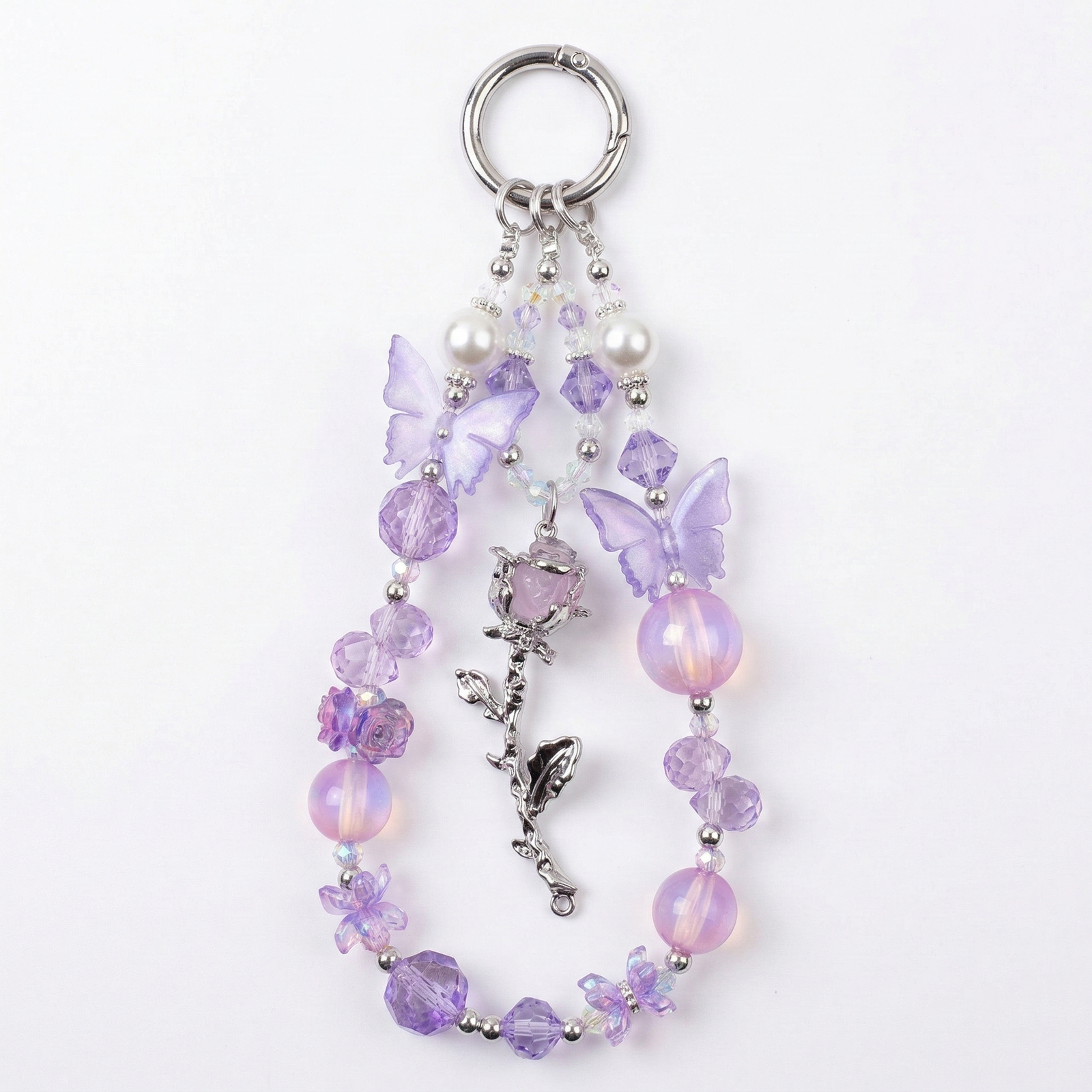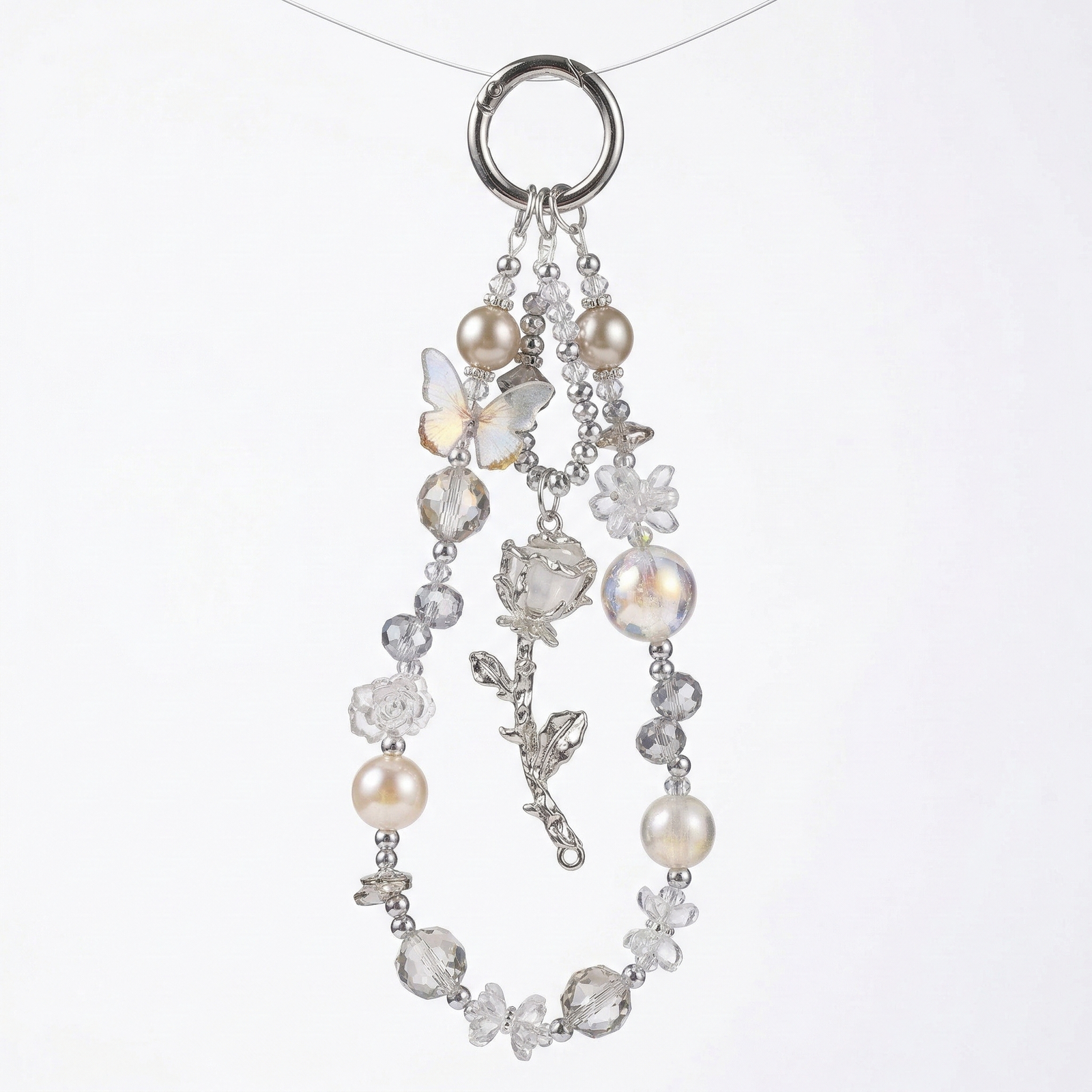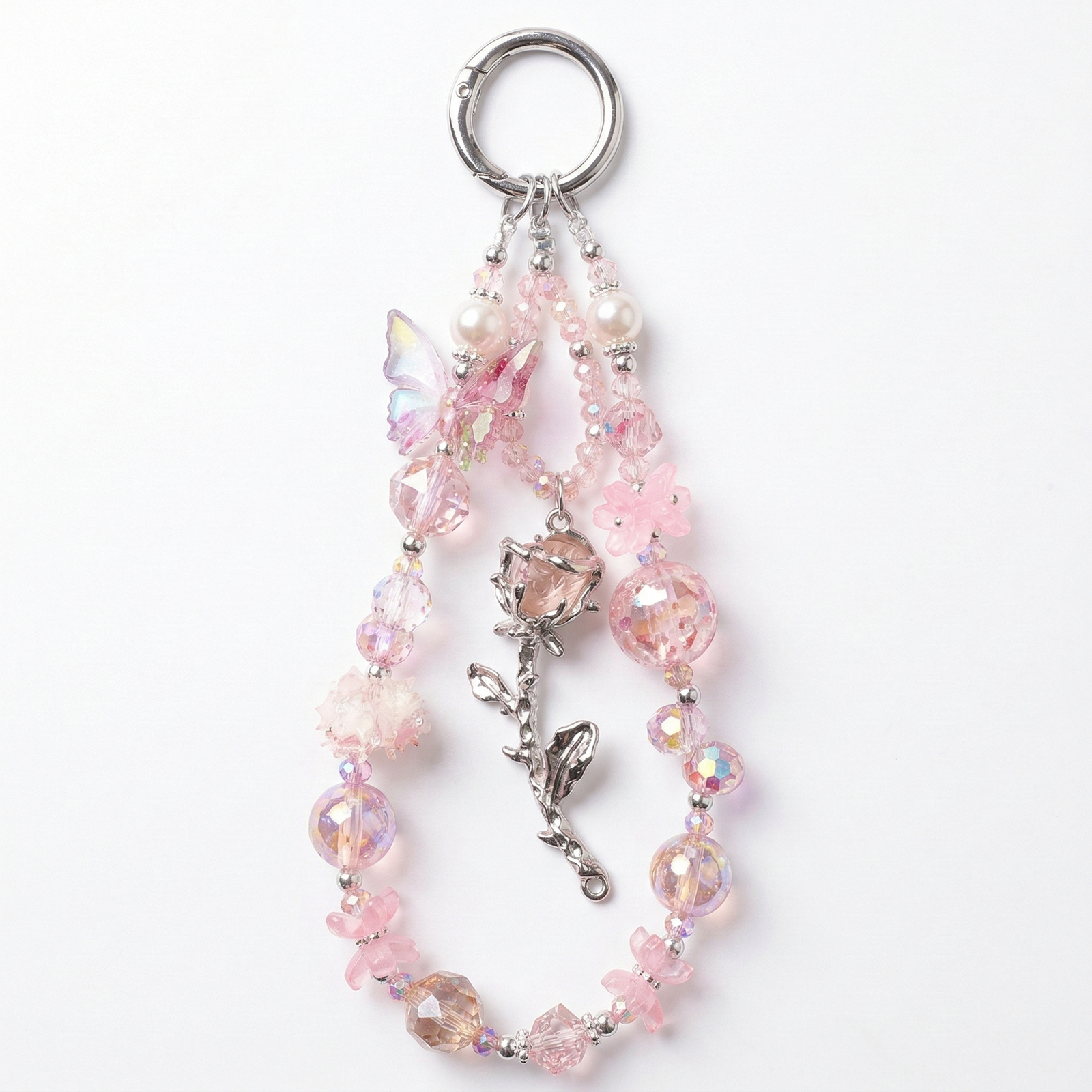 Enhance your phone with this elegant crystal and pearl beaded phone charm bracelet. Featuring a delicate combination of sparkling crystal beads, soft pink accents, and a charming rose pendant, this phone charm adds both beauty and functionality.